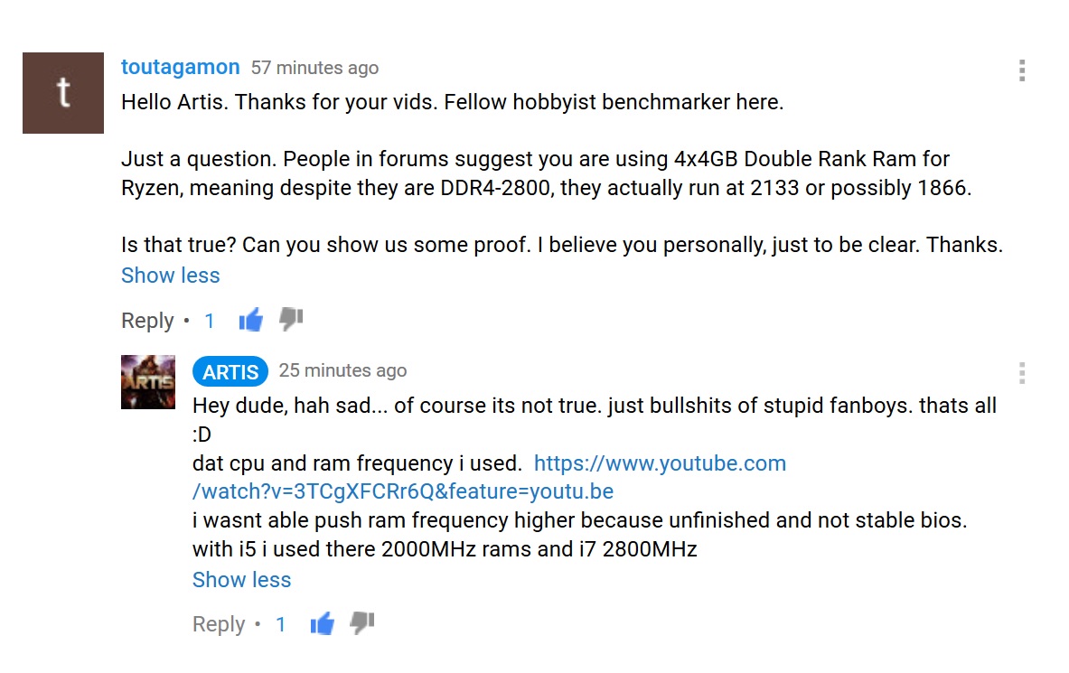 If we are talking of the same person i think, well he links benchmarks that at least show the setup and engages in intelligent debate, unlike this guy and a little band of brothers who come onto ryzen threads with the sole reason to denigrate amd products, with very little objectivity or even an attemp at debate.You mean like a certain AMD fan posts nothing but BF1 "benchmarks" (actually his own unsubstantiated observations) over and over and over again?